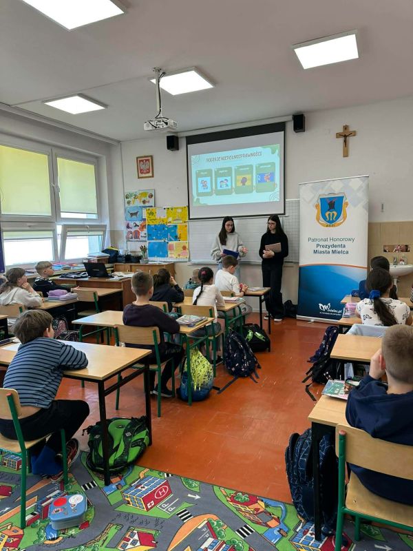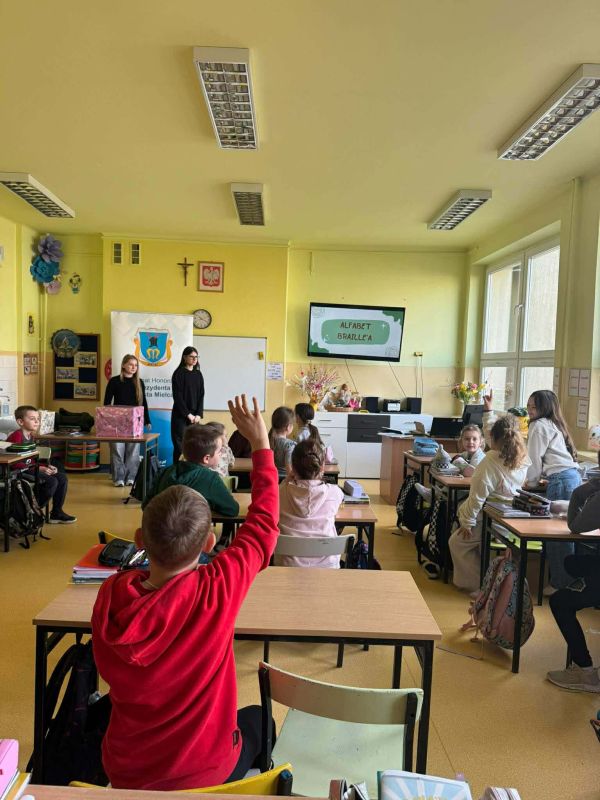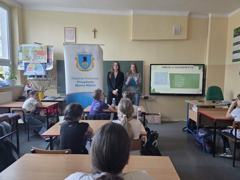 Edukacja w szkołach podstawowych. Dziewczęta prowadzą warsztaty dla młodszych kolegów i koleżanek.Podczas zajęć poruszają tematykę codziennego funkcjonowania osób z niepełnosprawnościami, ucząc akceptacji, szacunku i wrażliwości na potrzeby drugiego człowieka.